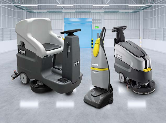 Lavadoras e secadoras de piso, enceradeiras, polidoras, aspiradores, extratoras.